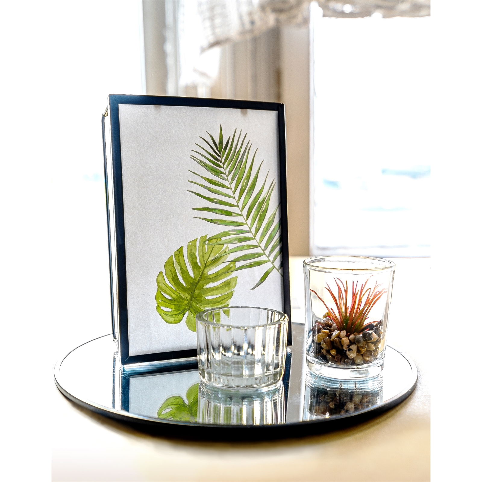 Dieses runde, verspiegelte Deko-Tablett mit Metallrahmen setzt einen modernen Akzent in Ihrer Wohnung. Bilderrahmen, Dekoglas mit Kunstpflanze und Teelichthalter runden das Set perfekt ab. Kerze nicht im Lieferumfang enthalten.