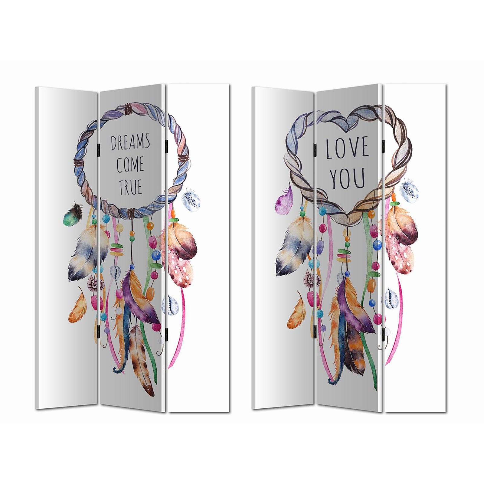 Wunderschöner Natur-Aufdruck. Der Paravent, den es in verschiedenen spirituellen Motiven wie Traumfänger oder Wellness gibt, verkörpert moderne Eleganz sowie stilvolle Gradlinigkeit und überzeugt mit seinem hochwertigen Druckmotiv. Diese Spanische Wand ist beidseitig bedruckt, besteht aus drei Paneelen und steht Ihnen so als flexibler Raumteiler oder stilbewusster Sichtschutz zur Verfügung. Hochqualitative Scharniere sichern eine stabile Verbindung der einzelnen Paneele untereinander und garantieren somit einen festen Stand des gesamten Paravents. Der Korpus des Paravents besteht aus Tannenholz und ist mit hochwertigem Leinwandstoff bezogen.