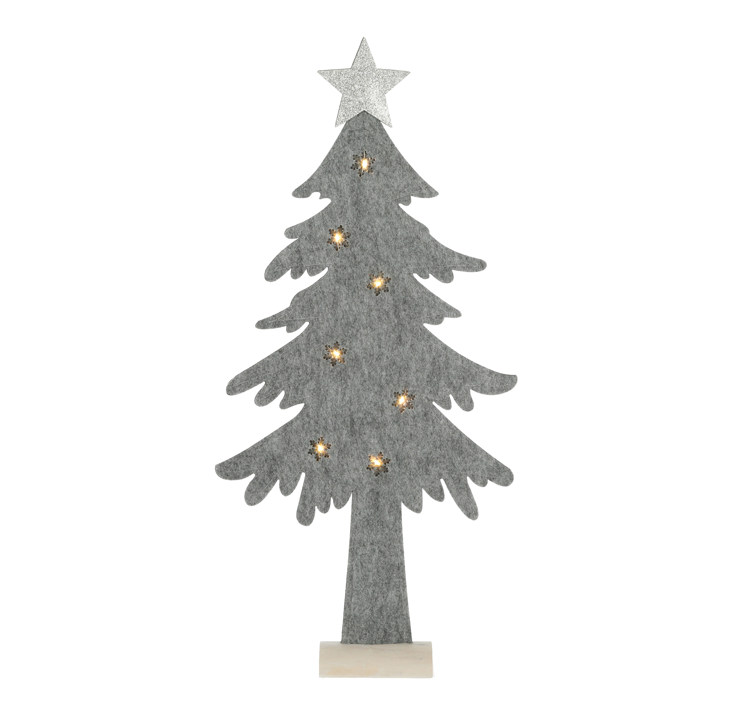 Der kleine stehene Tannenbaum in Grau ist mit einer 7 LED – Beleuchtung ausgestattet. Der Baum verbreitet sein wohlig warmes Licht durch viele kleine Sternchen. Ausgestattet für Batteriebetrieb und damit an vielseitig einzusetzen. Maße: B/H/T 31 x 67 x 6 cm, Material: Kiefernholz/Filz Polyester, für 2x AA Batterien (nicht im Lieferumfang enthalten)