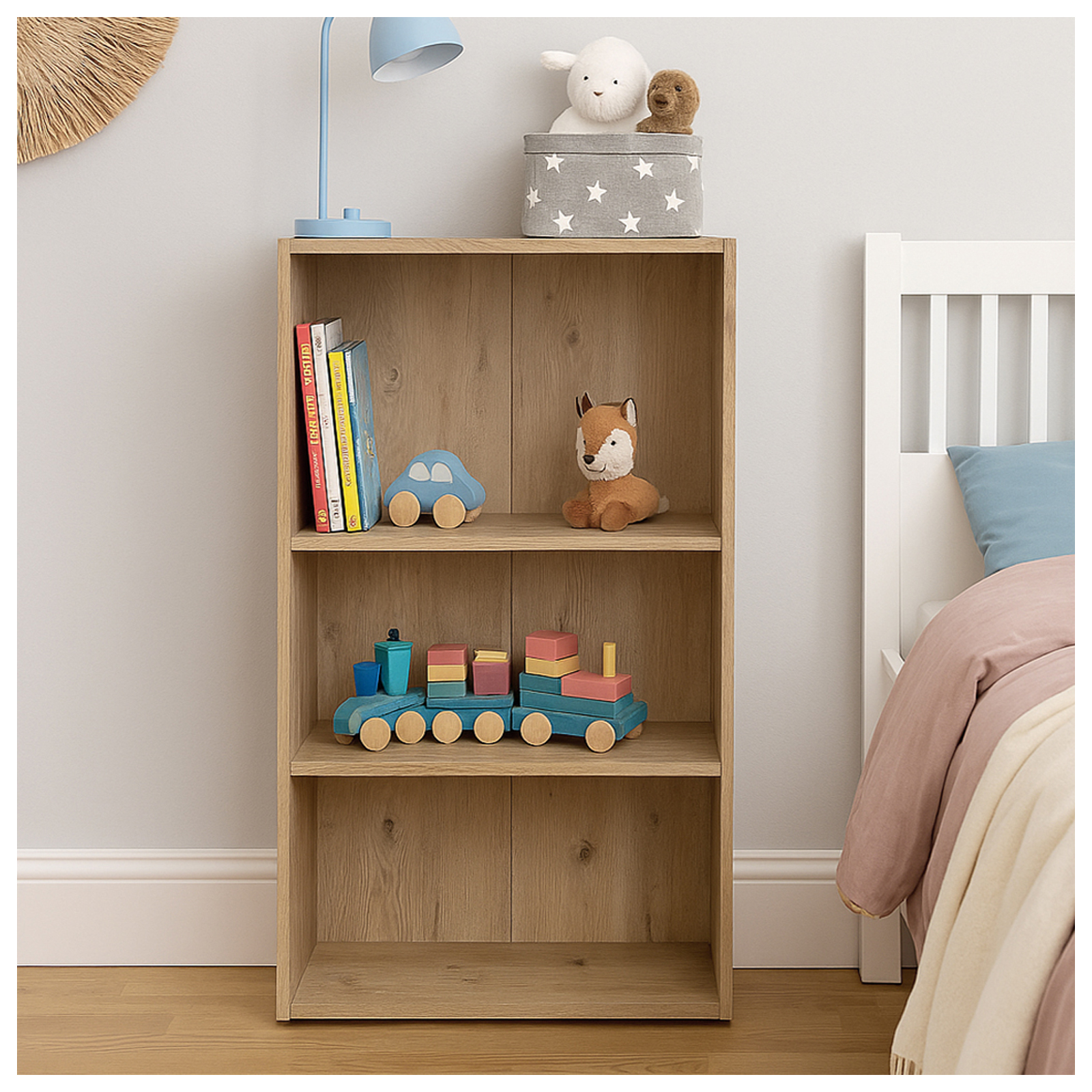 Dieses moderne Regal in Holzoptik überzeugt durch sein zeitloses Design, die kompakte Größe und seine Vielseitigkeit. Mit den Maßen B/H/T 60 x 115 x 30 cm passt es sowohl ins Wohnzimmer, Büro, Schlafzimmer oder Kinderzimmer. Dank 3 geräumiger Regalfächer bietet das Standregal genügend Platz für Bücher, Deko, Ordner oder Aufbewahrungsboxen.
