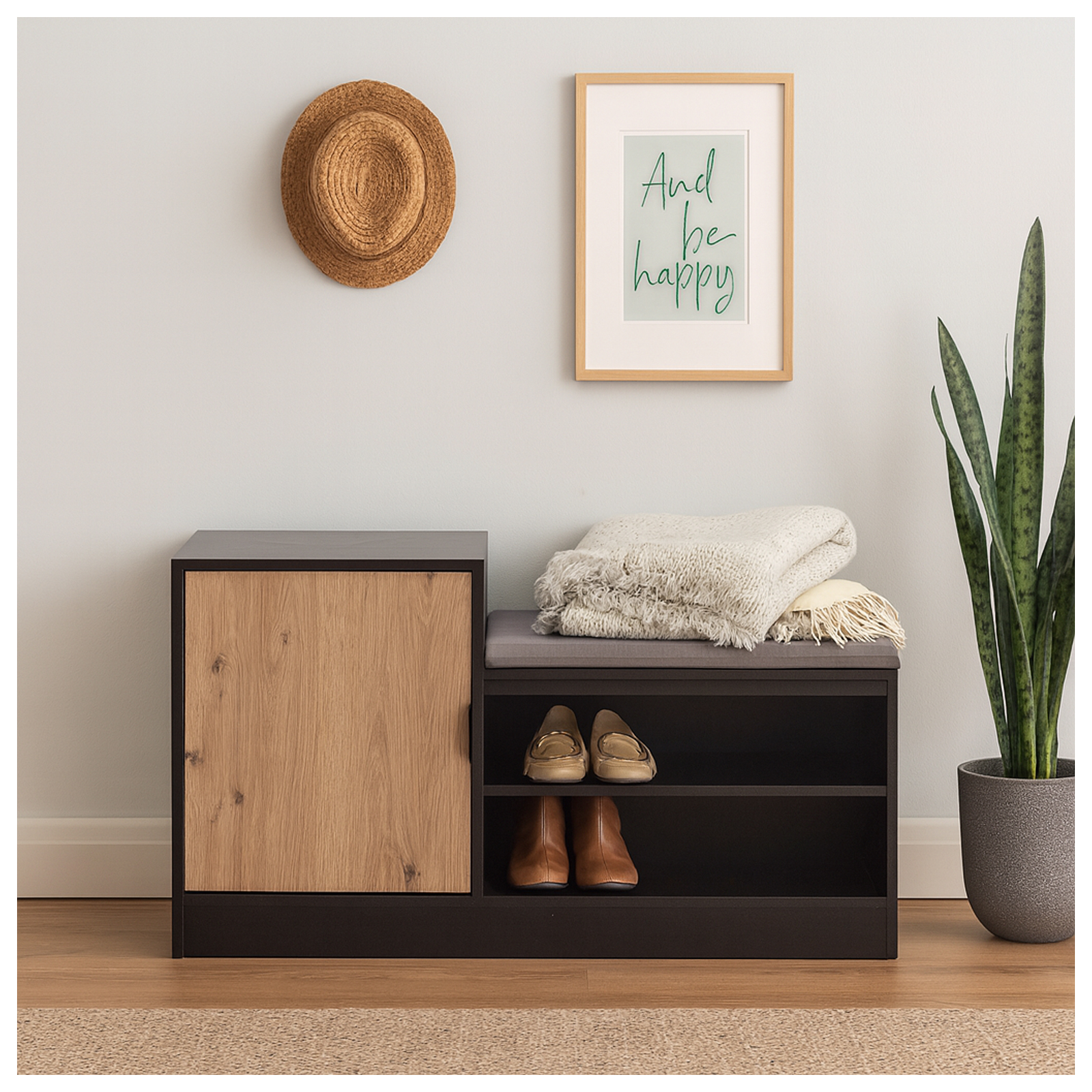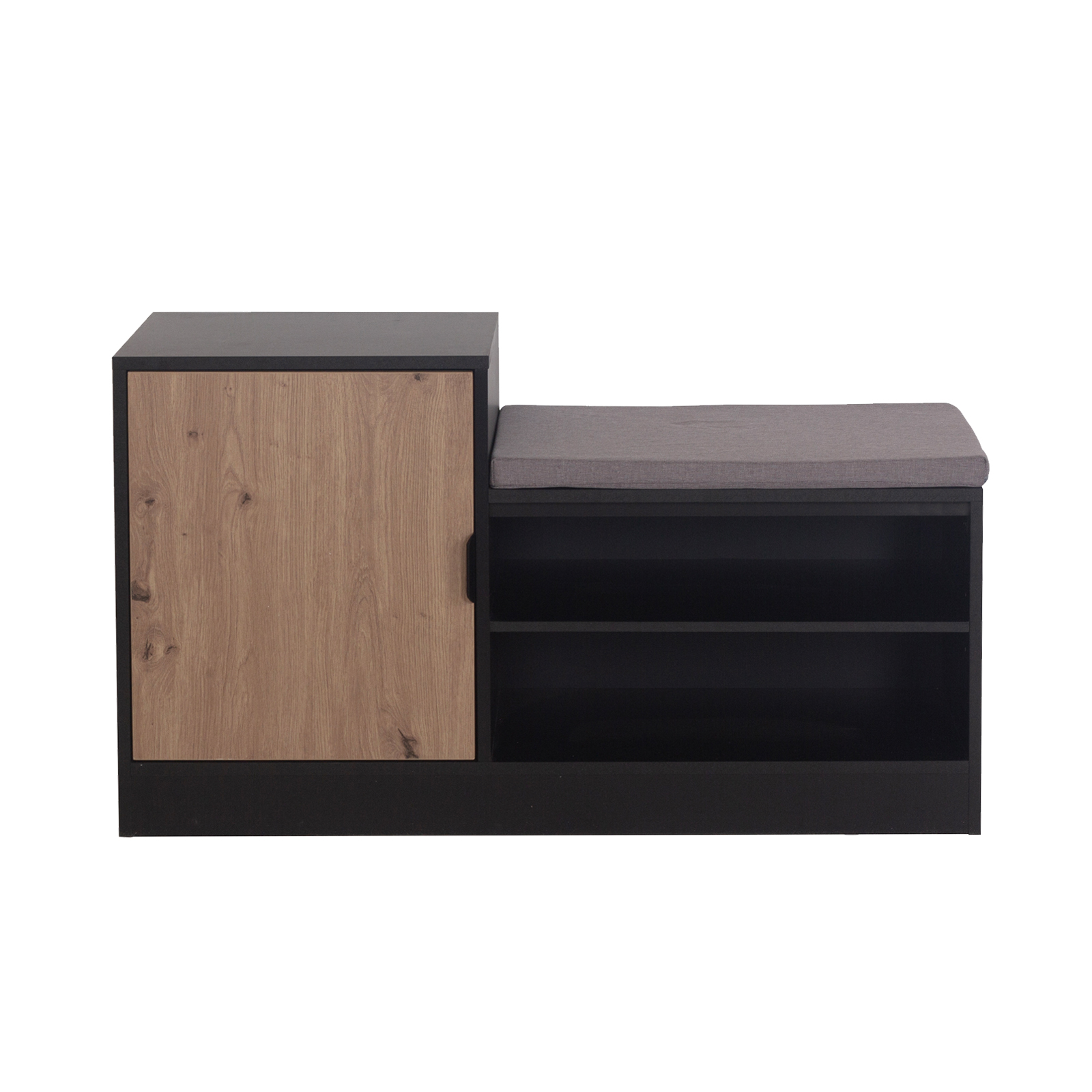 Die Kombination aus modernem Schwarz und Holzoptik passt sich hervorragend verschiedenen Einrichtungsstilen an und macht die Schuhbank Dana zu einem echten Blickfang im Eingangsbereich.