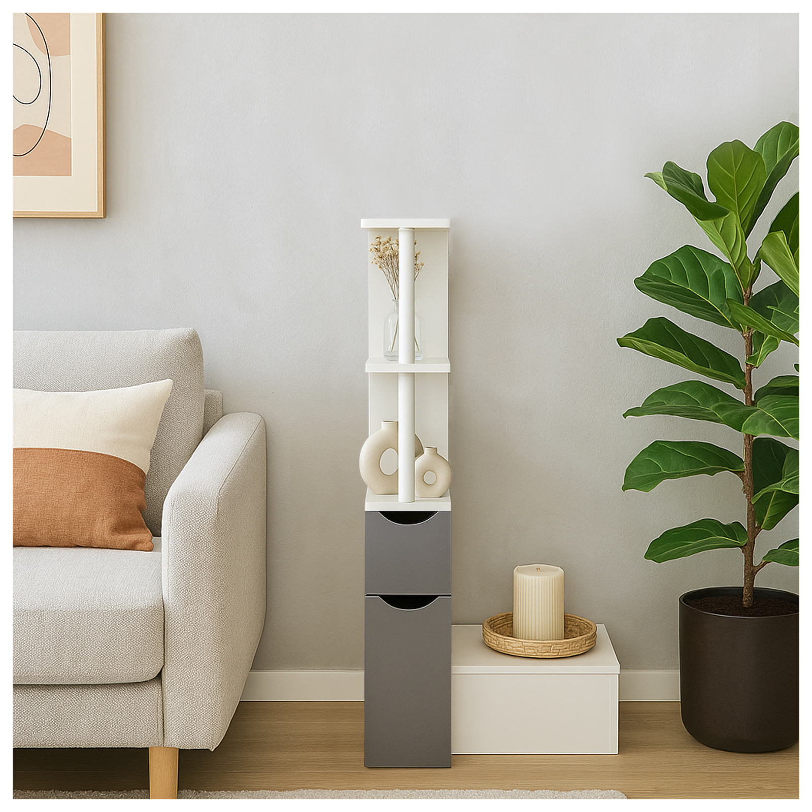 Dieses schmale Nischenregal ist die ideale Lösung für kleine Räume und enge Zwischenräume. Mit einer Breite von nur 15,3 cm passt es perfekt in Ecken, neben Schränke oder zwischen Möbelstücke. Die Kombination aus offenen Fächern und geschlossenen Türen bietet sowohl dekorativen Stauraum als auch Platz zum Verstauen.