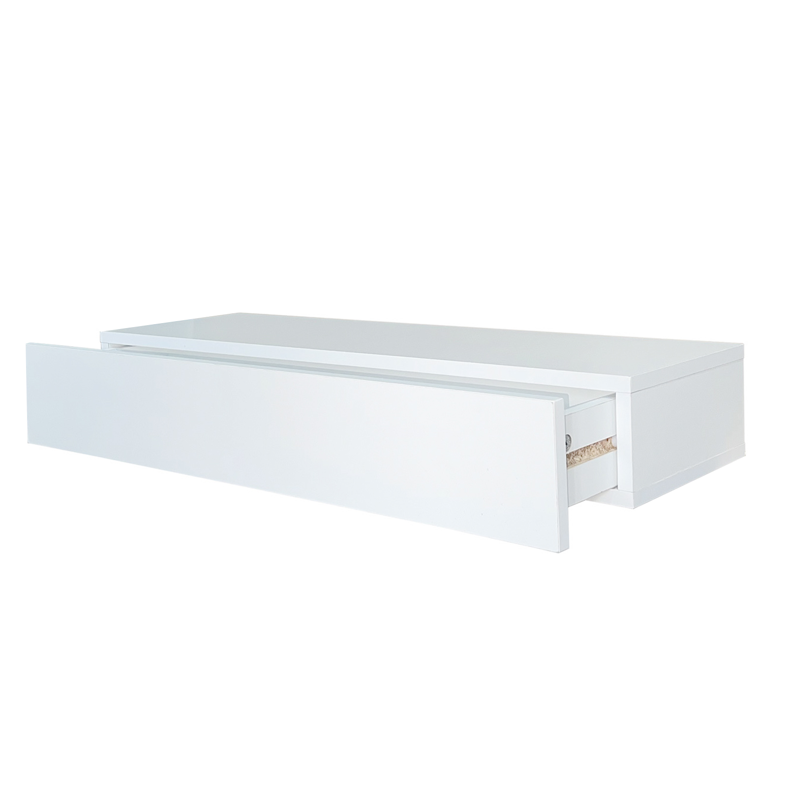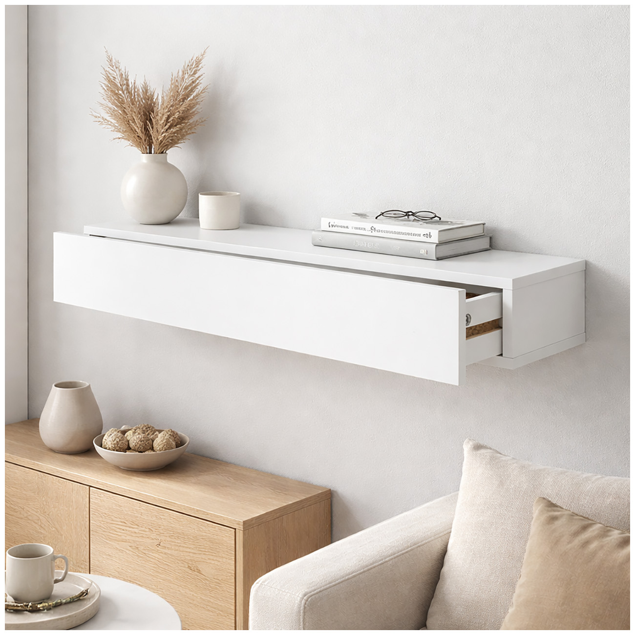 Dieses moderne Wandregal mit Schublade vereint ansprechendes Design mit praktischer Funktionalität. Mit seinen kompakten Maßen von 80 x 10 x 23,5 cm (B/H/T) eignet sich das schwebende Regal ideal für kleine Räume und schafft zusätzlichen Stauraum, ohne wertvolle Bodenfläche zu beanspruchen.
