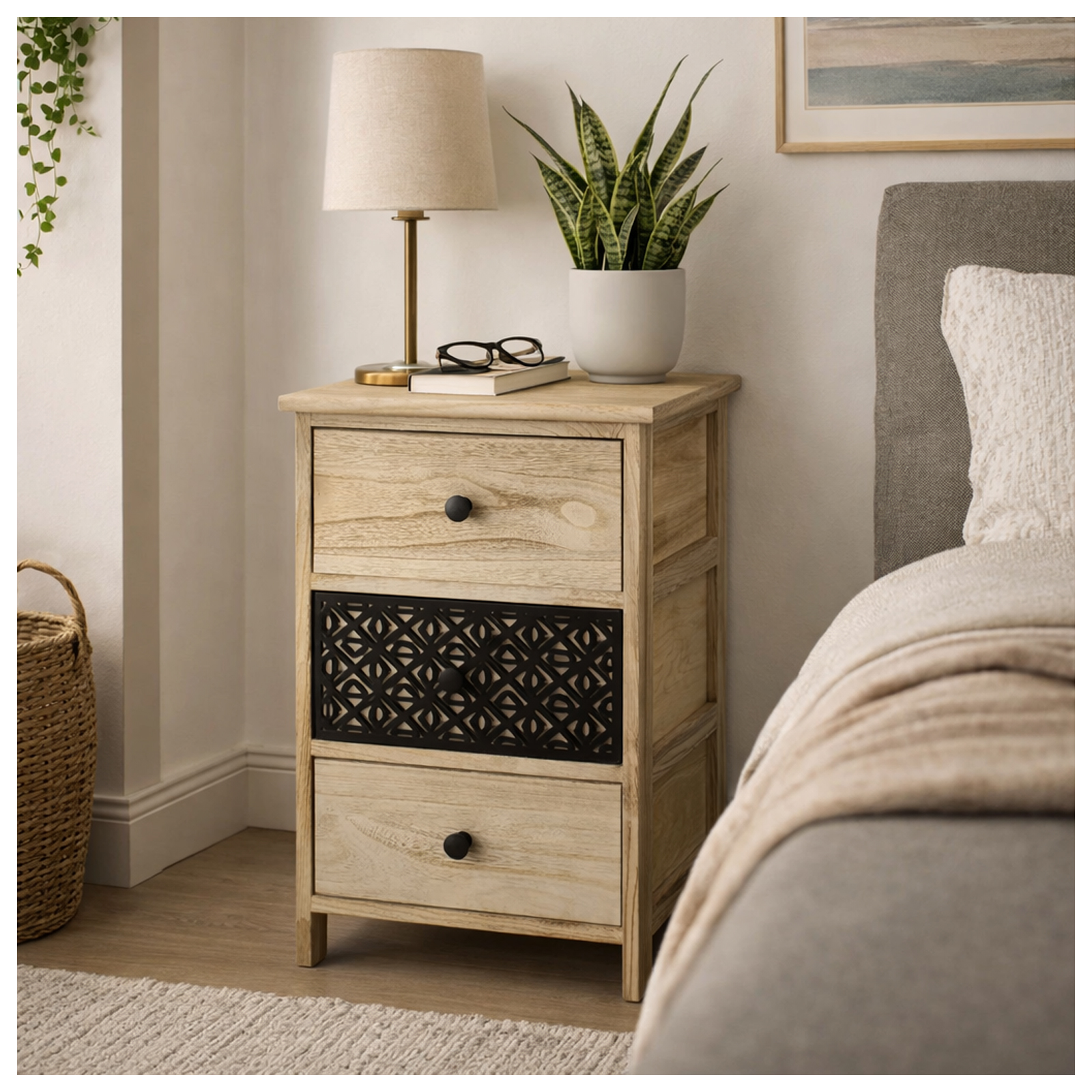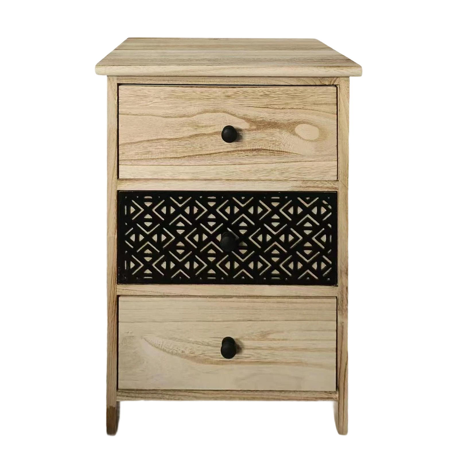Ein besonderes Highlight ist die mittlere Schublade mit dekorativer, kunstvoll gearbeiteter Front mit geometrischem Muster. Der dunkle Einsatz bildet einen eleganten Kontrast zum hellen Holz und setzt einen ausdrucksstarken Akzent. Die schlichten, runden Knopfgriffe unterstreichen das zurückhaltende Design und runden das Gesamtbild stilvoll ab.