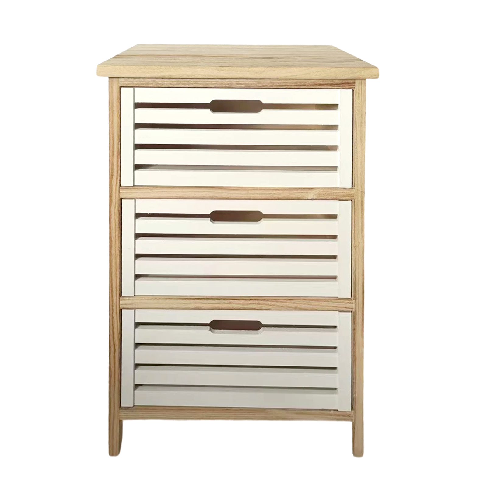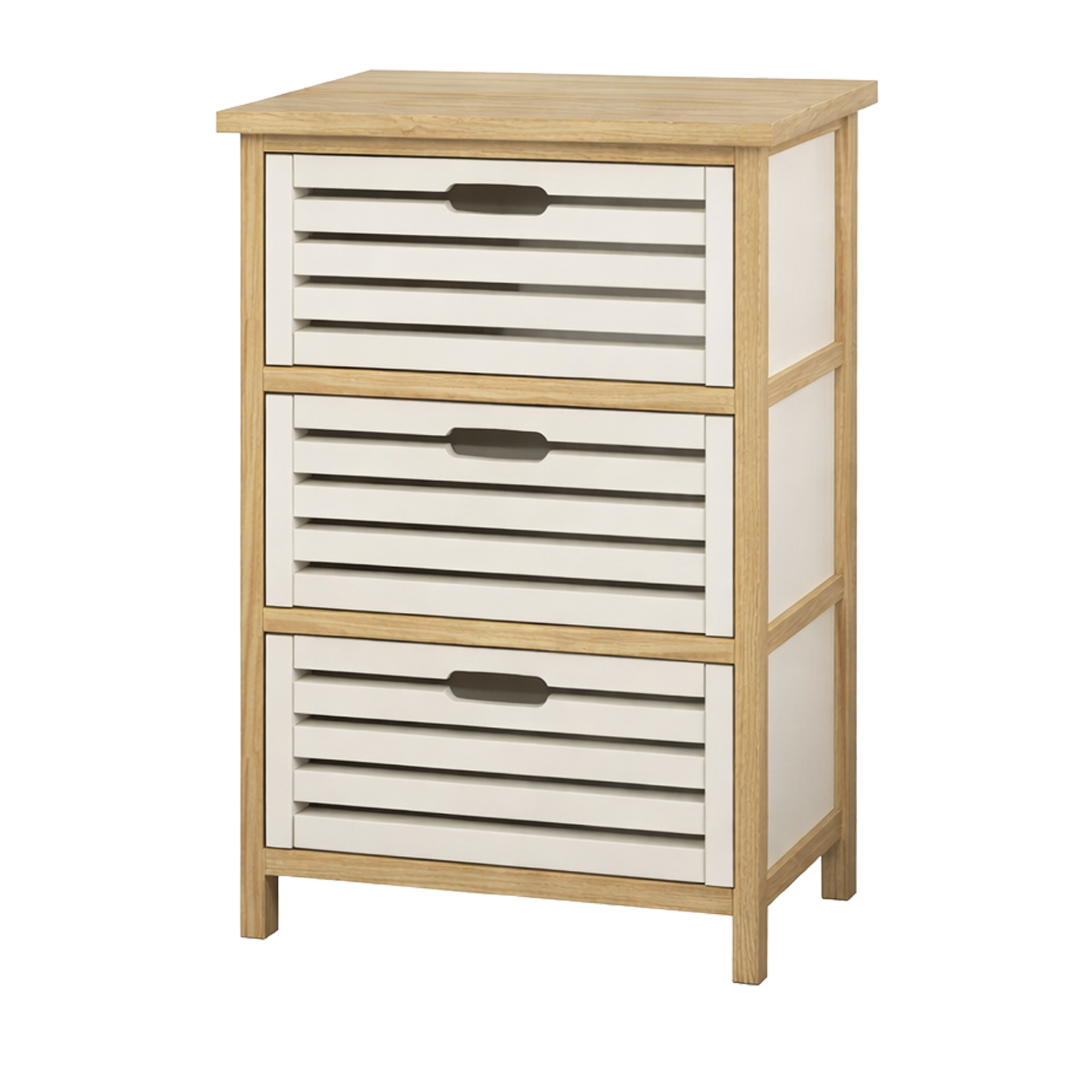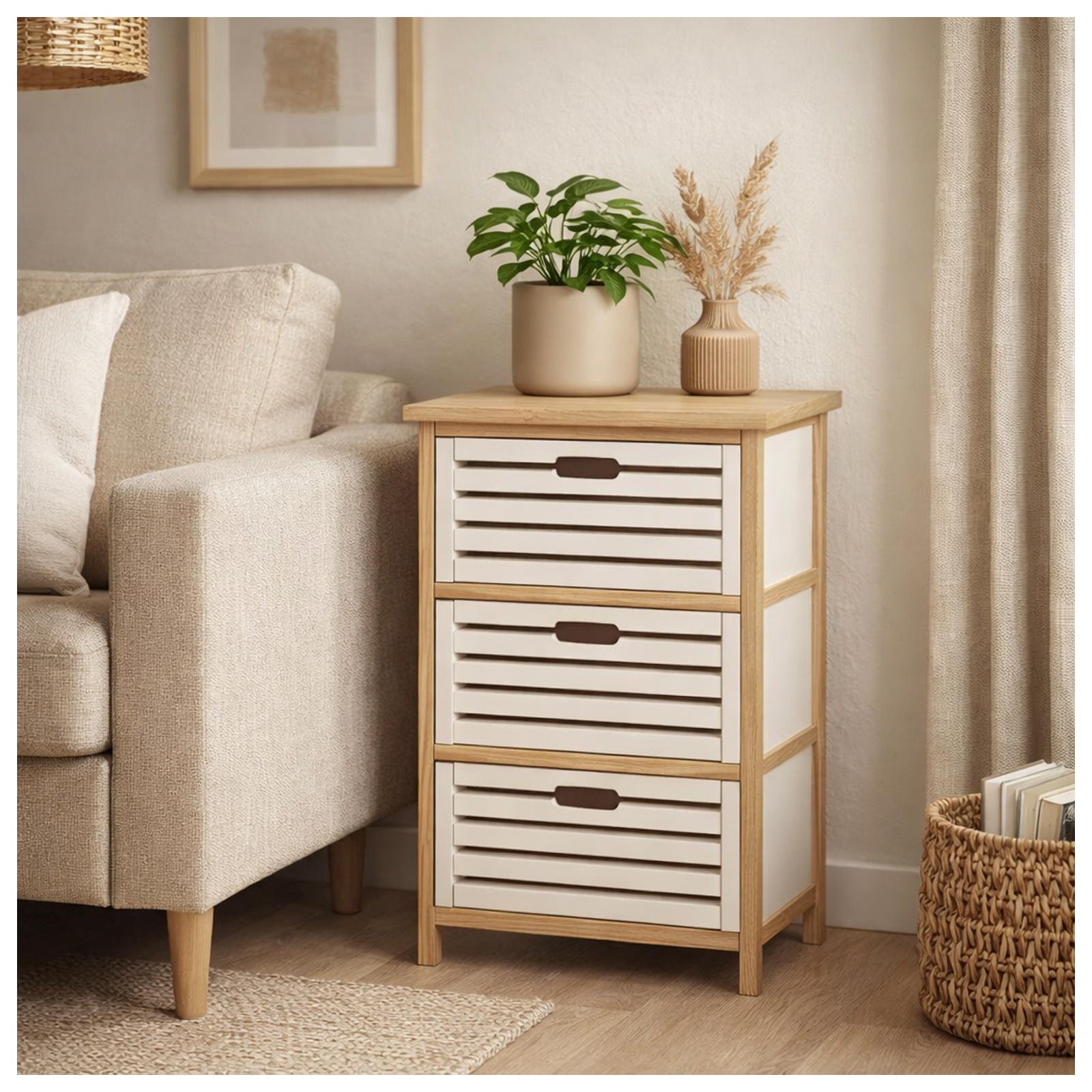Diese charmante Kommode mit 3 Schubladen vereint modernes Design mit skandinavischem Flair und Landhauscharme und schafft Ordnung in deinem Zuhause. Der stabile Rahmen in natürlicher Holzoptik sorgt für eine warme, wohnliche Atmosphäre, während die weißen Fronten mit horizontalen Lamellen dem Möbelstück einen modernen Charakter verleihen. Die integrierten Griffmulden ermöglichen ein komfortables Öffnen und unterstreichen das minimalistische Design.