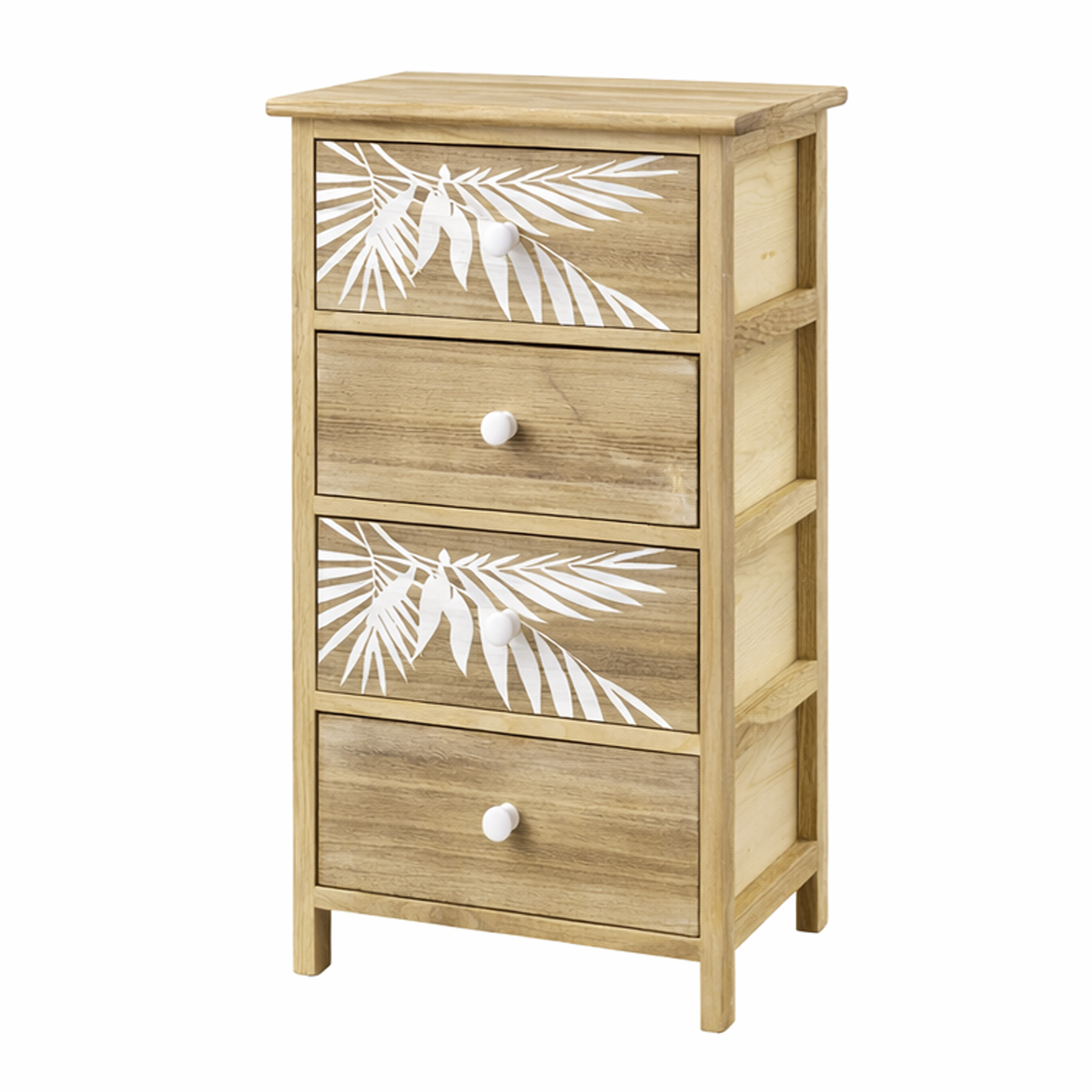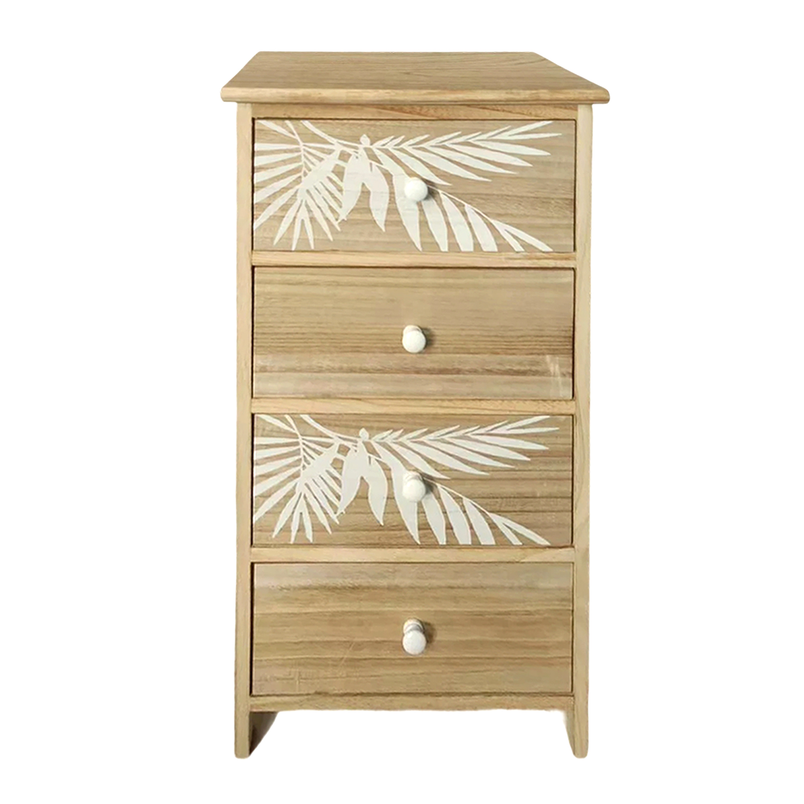 Diese dekorative Kommode aus Paulowniaholz verbindet natürliches Wohndesign mit funktionalem Stauraum. Das weiße Palmen-Dekor auf zwei der vier Schubladenfronten verleiht der Holzkommode eine moderne, helle und freundliche Ausstrahlung und macht sie zum echten Blickfang im Boho-, Skandi- oder Landhausstil. Die farblich abgestimmten runden Knopfgriffe fügen sich harmonisch in das Gesamtbild ein und unterstreichen die stilvolle Optik.