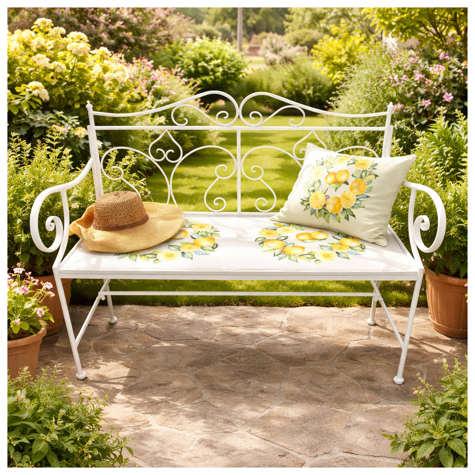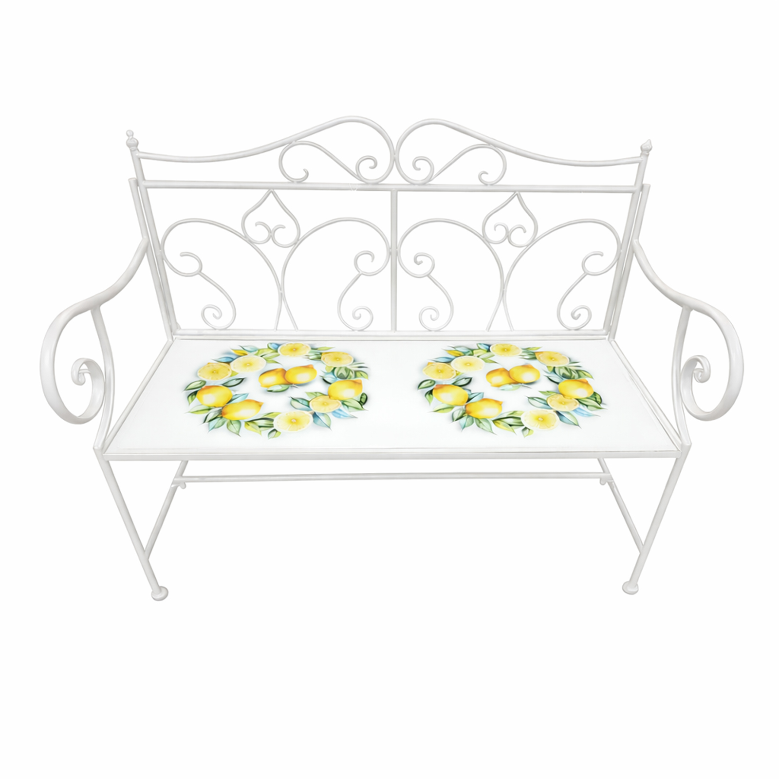 Diese Gartenbank bringt mediterranen Charme in Ihre grüne Wohlfühloase. Das weiße Metallgestell mit geschwungenen Linien harmoniert perfekt mit der dekorativen Tischplatte mit Zitronenmotiv und schafft eine einladende, sommerliche Atmosphäre.