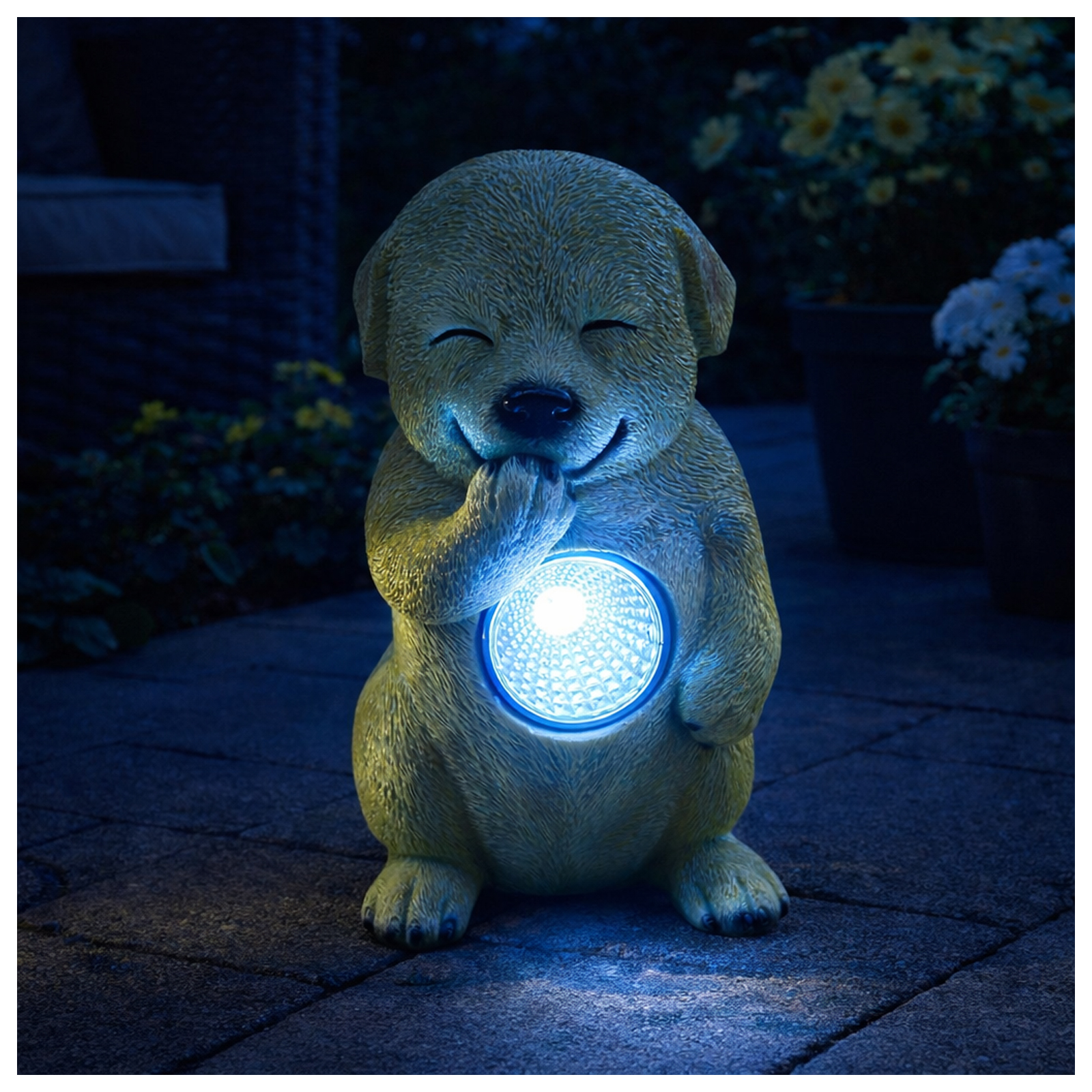 Gefertigt aus robustem Polyresin, ist die Figur wetterfest und langlebig. Die Solarbeleuchtung lädt sich tagsüber automatisch auf und schaltet sich bei Dämmerung selbstständig ein – ganz ohne Stromkosten oder Kabel.