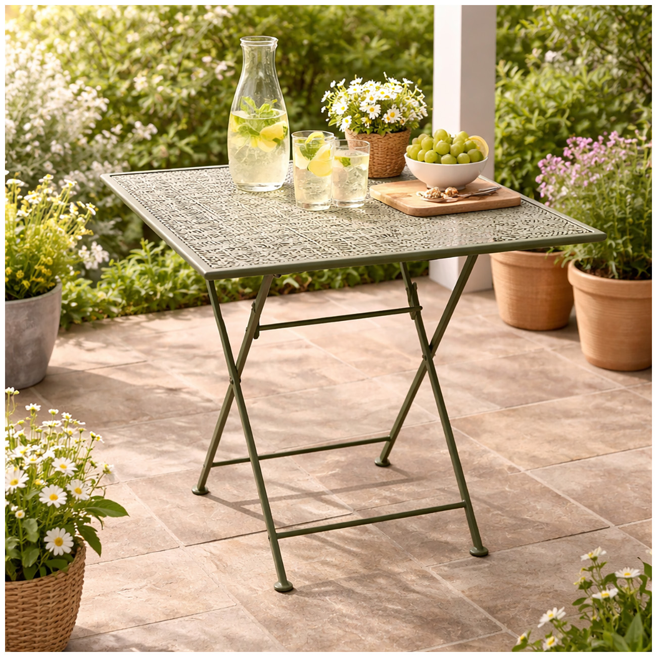 Dieser Gartentisch im Vintage-Stil erinnert an laue Sommernachmittage bei Kaffee und Kuchen. Das filigrane Metallgestell und die Tischplatte mit dekorativem Lochmuster verleihen dem Tisch nostalgischen Charme. Ob Innen- oder überdachter Außenbereich – der Tisch ist perfekt für kleine Balkone, romantische Terrassen oder den Garten im Landhausstil geeignet.