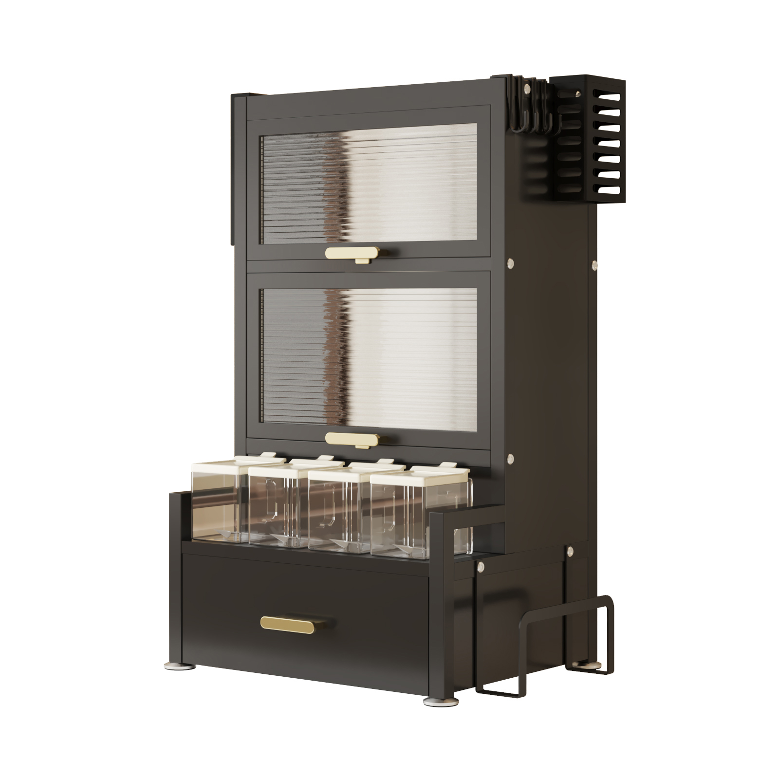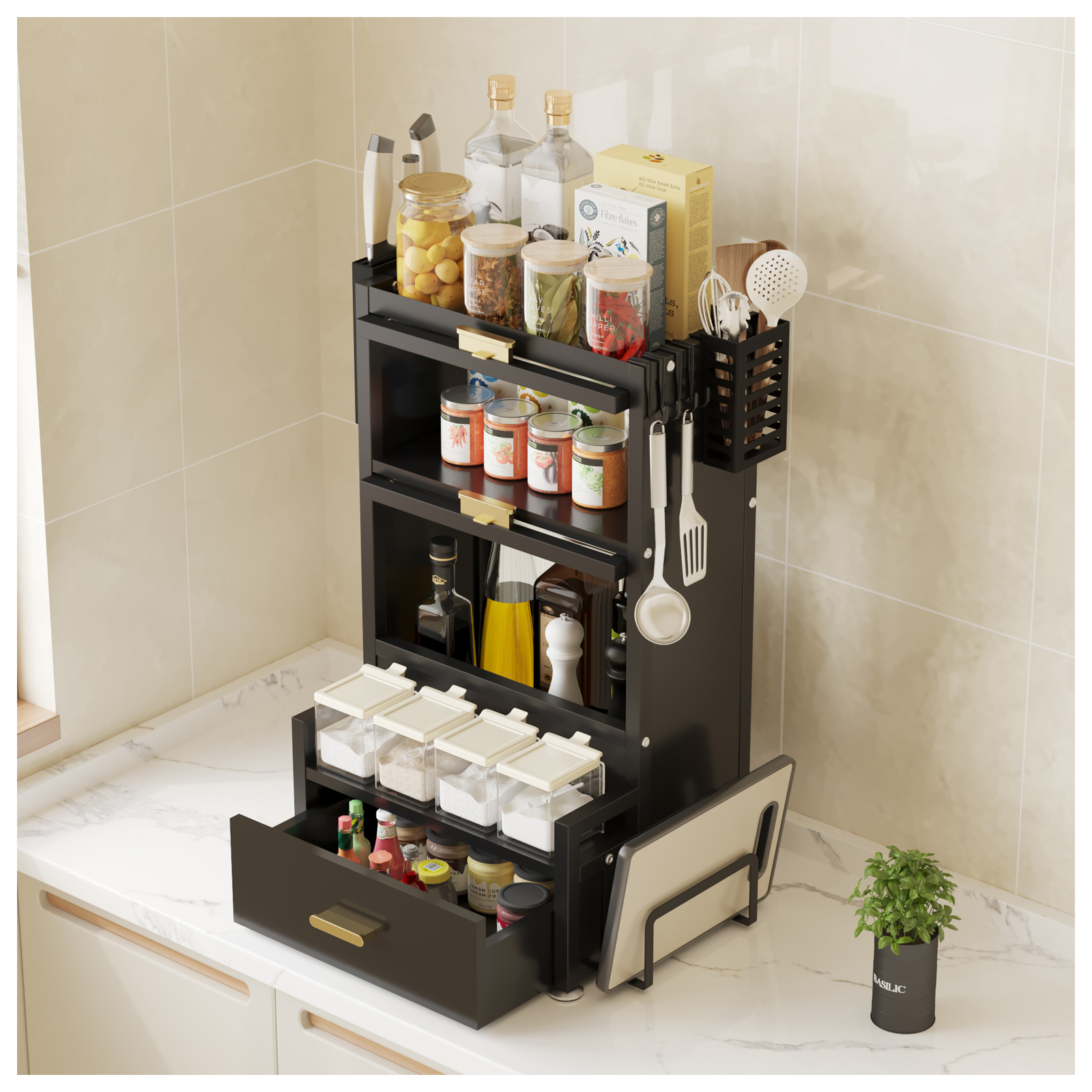 Das praktische Gewürzregal sorgt für perfekte Organisation Ihrer Gewürze, Öle und Küchenutensilien. Mehrere Ebenen, 2 Regalfächer mit Türen, eine Schublade sowie integrierte Halter schaffen zusätzlichen Stauraum auf kleiner Fläche.