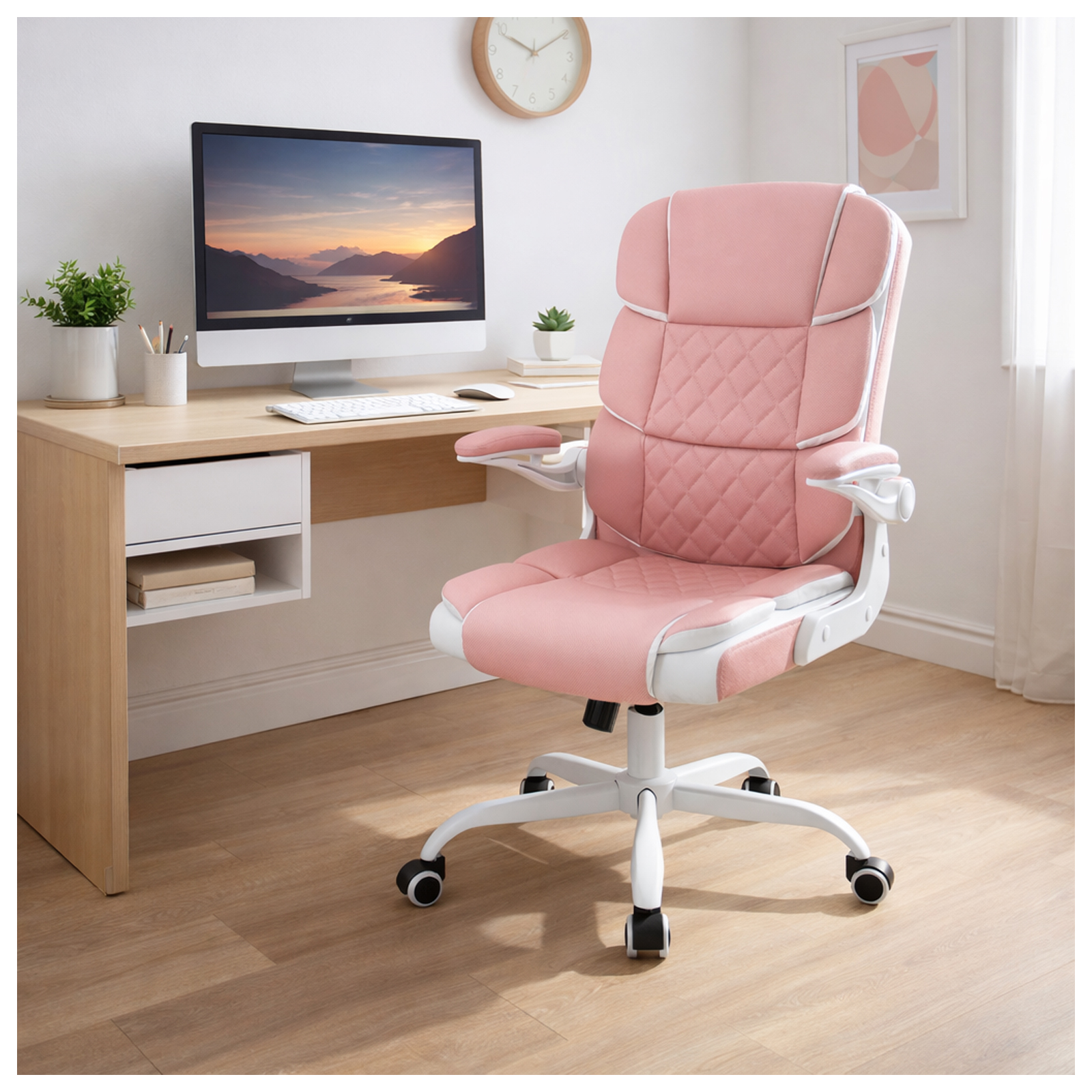 Besonders praktisch: Die Armlehnen lassen sich mit wenigen Handgriffen hochklappen. So kann der Stuhl vollständig unter den Schreibtisch geschoben werden – das spart wertvollen Platz und schafft Ordnung.