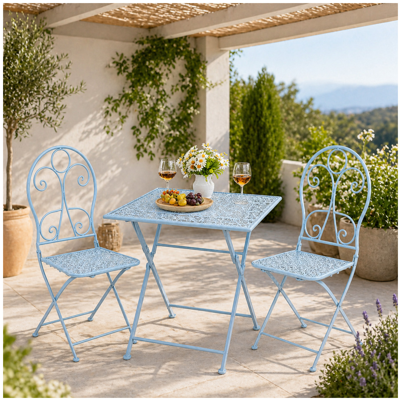 Ob auf kleinen Balkonen, romantischen Terrassen, im Garten oder im Innenbereich – die Tischgruppe ist vielseitig einsetzbar und schafft eine gemütliche Atmosphäre. Die beiden Stühle lassen sich nach Gebrauch einfach zusammenklappen und platzsparend verstauen. So verbindet dieses Ensemble stilvolle Optik mit praktischer Funktionalität.
