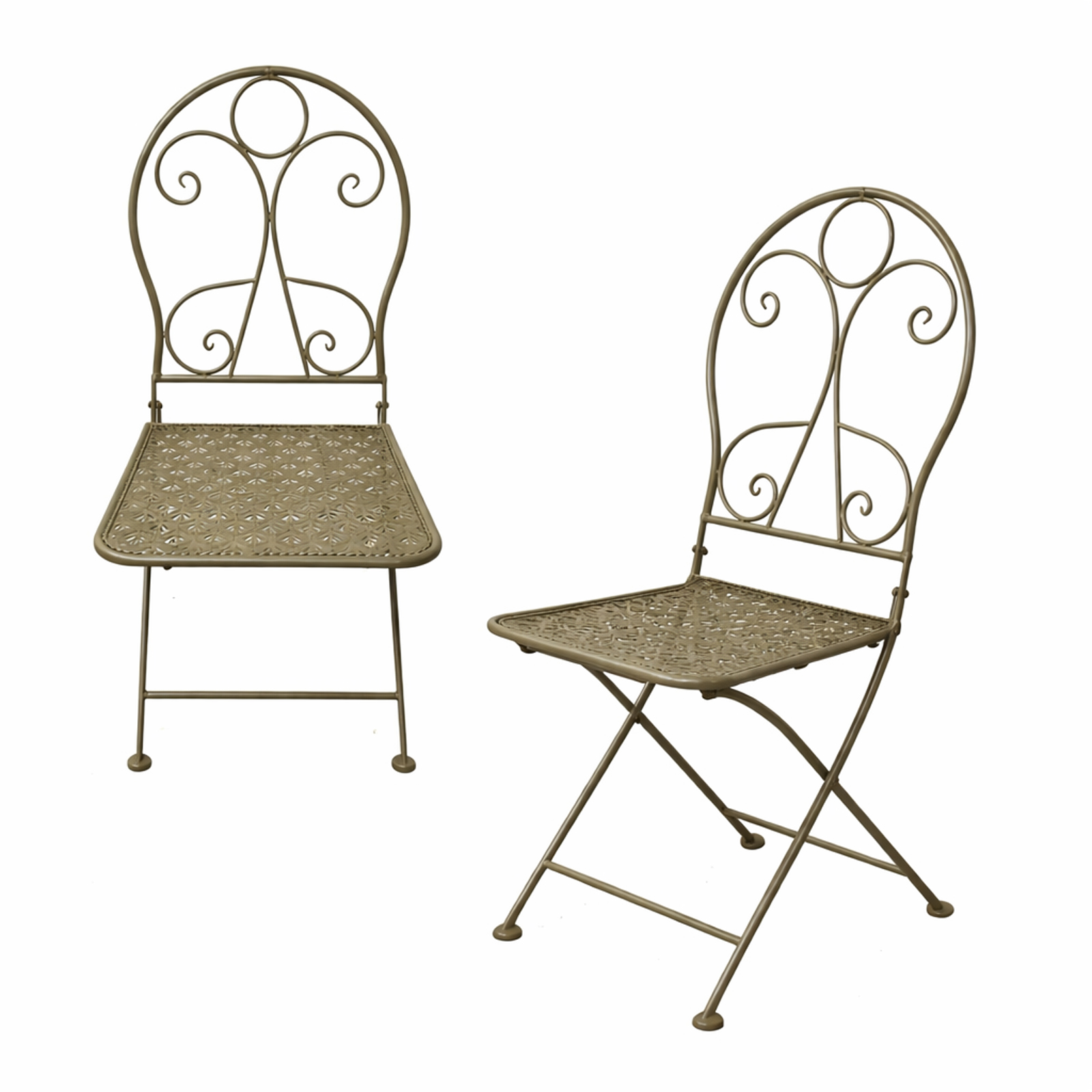 Diese stilvolle Tischgruppe im Vintage-Stil, bestehend aus einem Tisch und zwei passenden Stühlen, erinnert an laue Sommernachmittage bei Kaffee und Kuchen. Das filigrane Metallgestell und die dekorativen Lochmuster in Tischplatte und Sitzflächen verleihen dem Set einen nostalgischen Charme. Feine Schnörkel in den Rückenlehnen unterstreichen den klassischen Landhausstil und machen die Gruppe zu einem echten Blickfang.