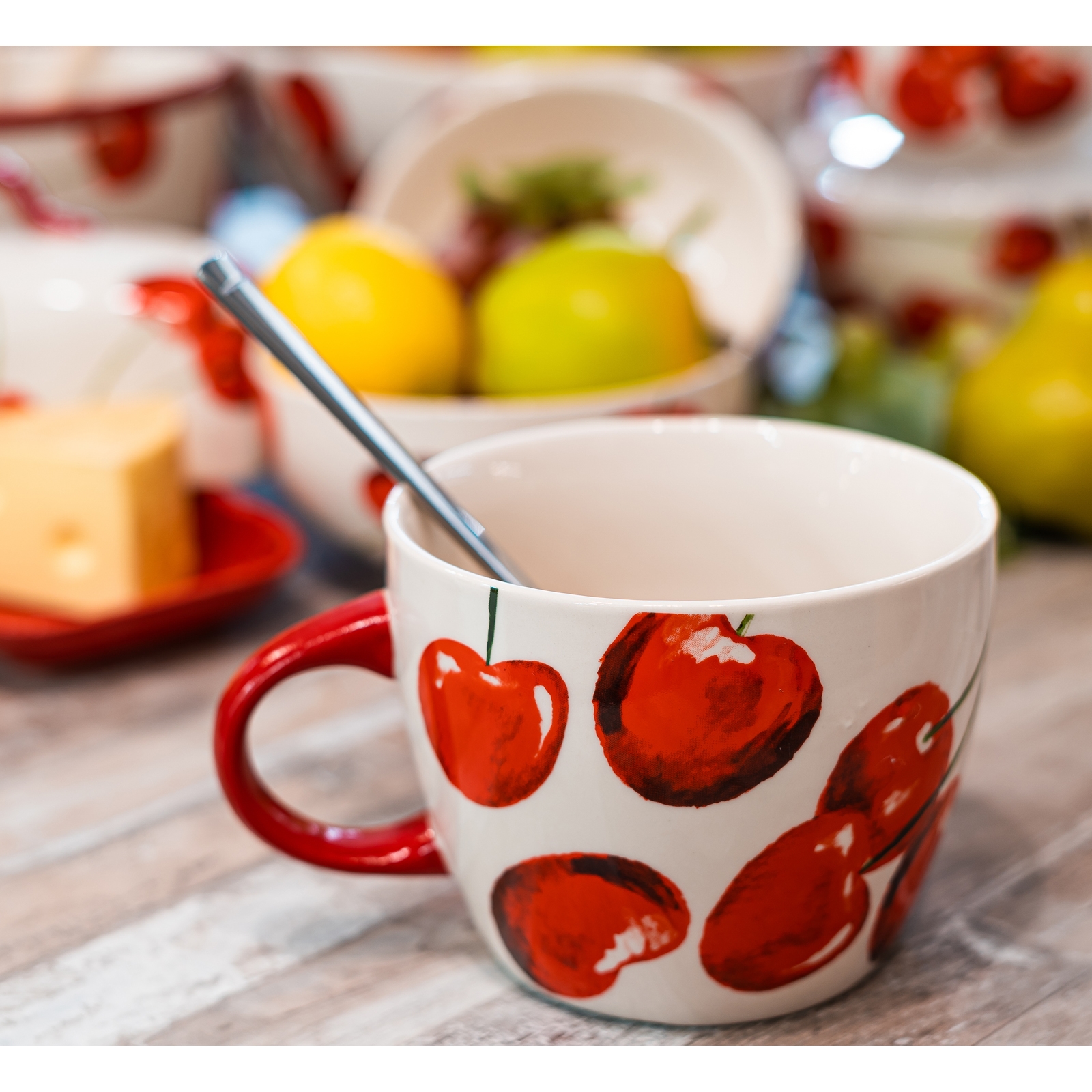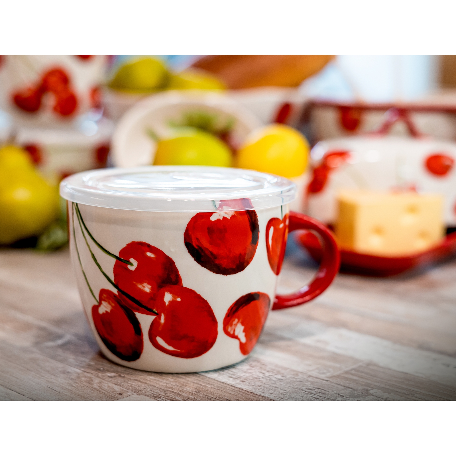 Praktisches Geschirr aus Keramik mit farbigen Dekoren im Landhausstil. Die Suppentassen mit Deckel sind die Alternative zum Mikrowellengeschirr aus Kunststoff. Aber auch als Servierschüssel und Vorratsdose finden diese Verwendung. Mikrowellen- und spülmaschinengeeignet, Maße Ø 13 cm, Höhe 10 cm, Breite mit Henkel 16,5 cm, Nutzinhalt 500 ml (Randvollvolumen 750 ml)