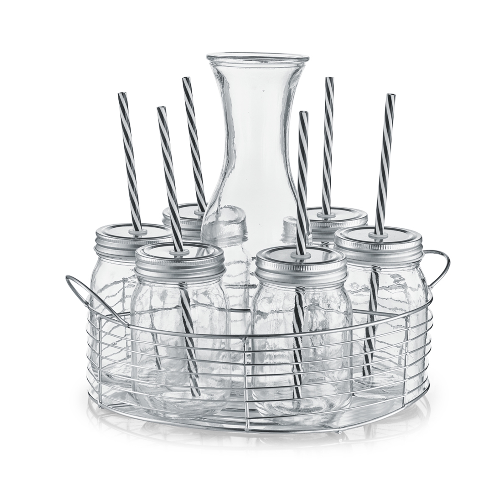 | Lieferumfang: | 1 Karaffe, 6 Gläser mit Deckel und Strohhalm, 1 Tragekorb |