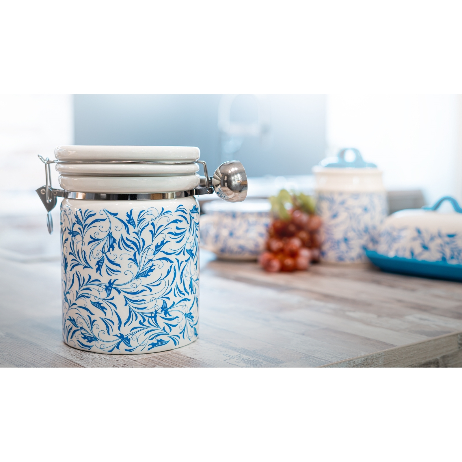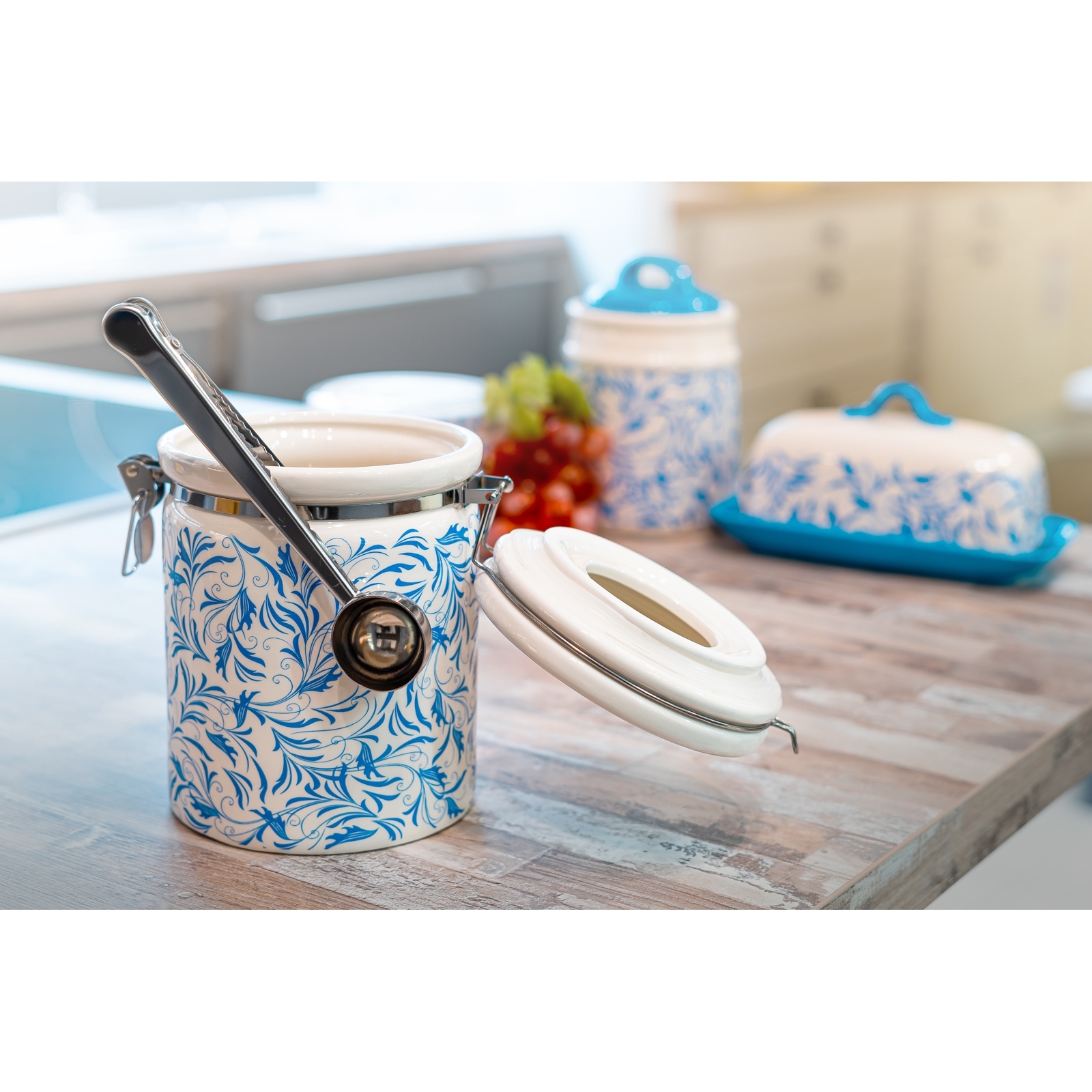Diese Vorratsdose aus Keramik eignet sich ideal zur Aufbewahrung von Kaffee. Verziert mit farbigen Dekoren ist sie zudem der Blickfang in Ihrer Küche im Landhausstil. Deckel mit Bügelverschluss schließt die Dose luftdicht ab und erhält so das vollmundige Aroma. Mit dem mitgelieferten Löffel lässt sich das Kaffeepulver exakt portionieren. Maße Ø 12,5 cm, Höhe 17,5 cm, Nutzinhalt 1200 ml