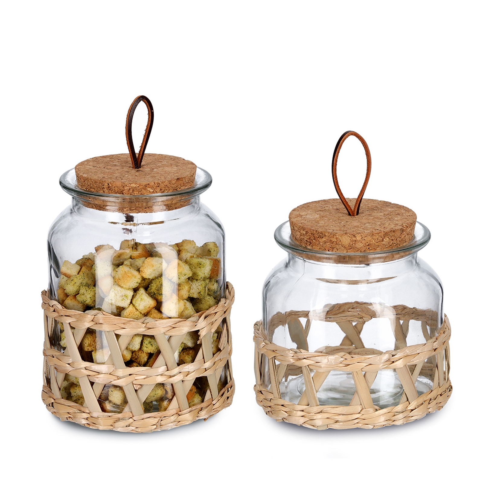 Dieser dekorative Glasbehälter hat ein hübsches Strohgeflecht als Ummantelung und einen Korkdeckel zum verschließen. Damit man den Deckel problemlos anheben kann, ist eine Ziehschlaufe angebracht. Das Vorratsglas gibt es in zwei Größen: 0,6 Liter Ø 11,7 cm x 12 cm oder 1 Liter Ø 12 cm x 15,5 cm