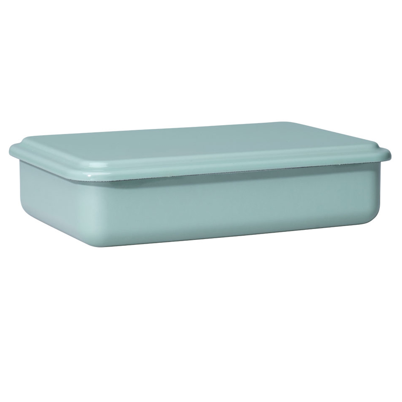 Die multifunktionalen Vorratsbehälter bestehen aus einem rechteckigen Emaille-Behälter mit Emaille-Deckel und sind in drei Farben erhältlich: in klassischem Emailleweiß sowie in Salbeigrün und Heidelbeerblau. Die Behälter mit Deckel sind stapelbar und ideal zum Verstauen von Lebensmitteln in Küche und Kühlschrank. Die Behälter sind backofenfest, daher ist Backen/Gratinieren im Backofen möglich. Maße: L/B/H 23 x 15 x 5 cm