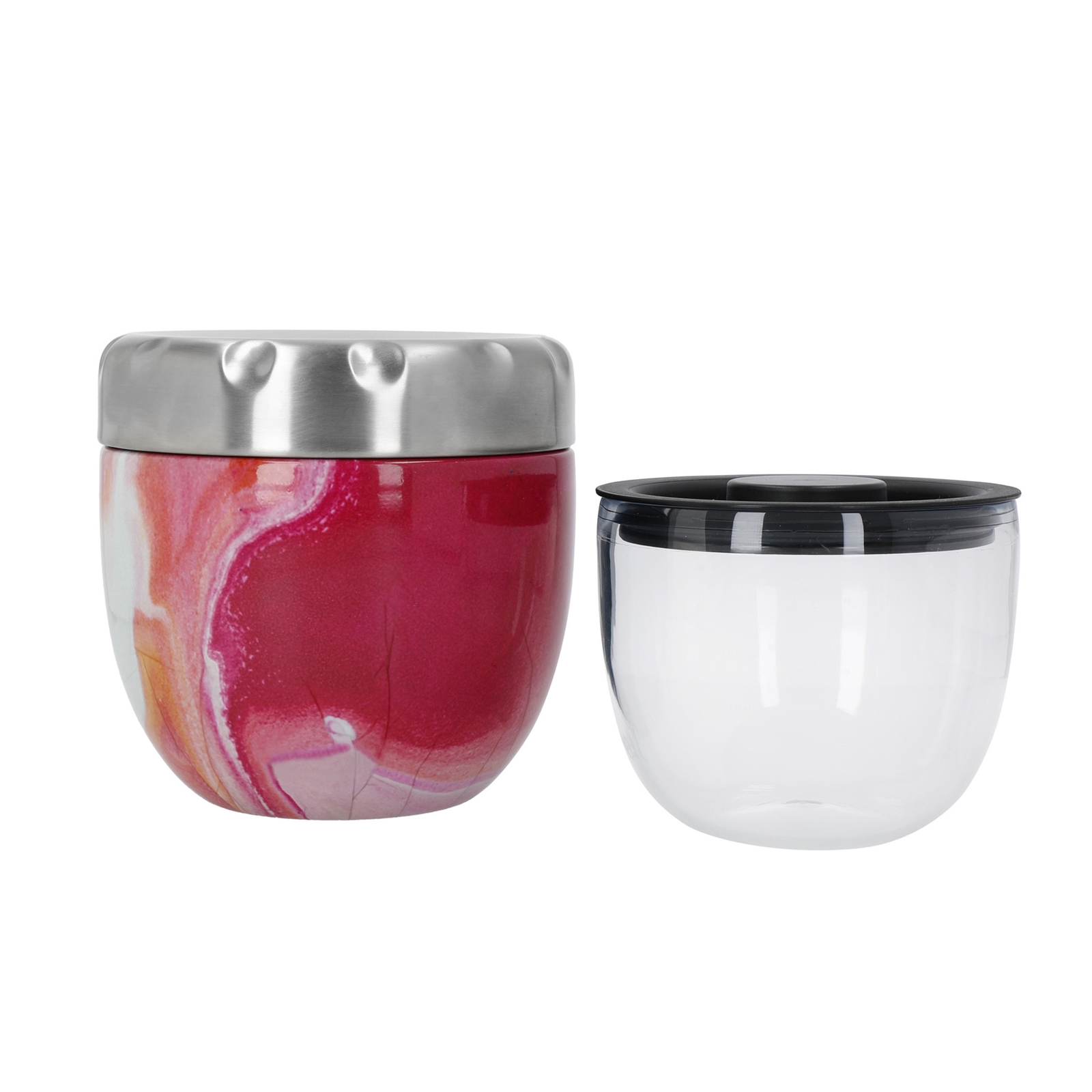 Thermobehälter aus Edelstahl mit auffälligem Druck in Marmoroptik. Innere Schale aus Tritan™ ist mikrowellen- und gefrierfachgeeignet. Bereiten Sie Ihre Mahlzeiten für unterwegs bequem zuhause vor. Eintöpfe und Nudelgerichte bleiben im Behälter bis zu 7 Stunden lang heiß, Joghurt und Salate bis zu 11 Stunden lang kalt. Maße Edelstahlbehälter Ø 12 x 12 cm, Fassungsvermögen 636 ml, Maße Kunststoffschale Ø 10 x 8,5 cm, Fassungsvermögen 414 ml