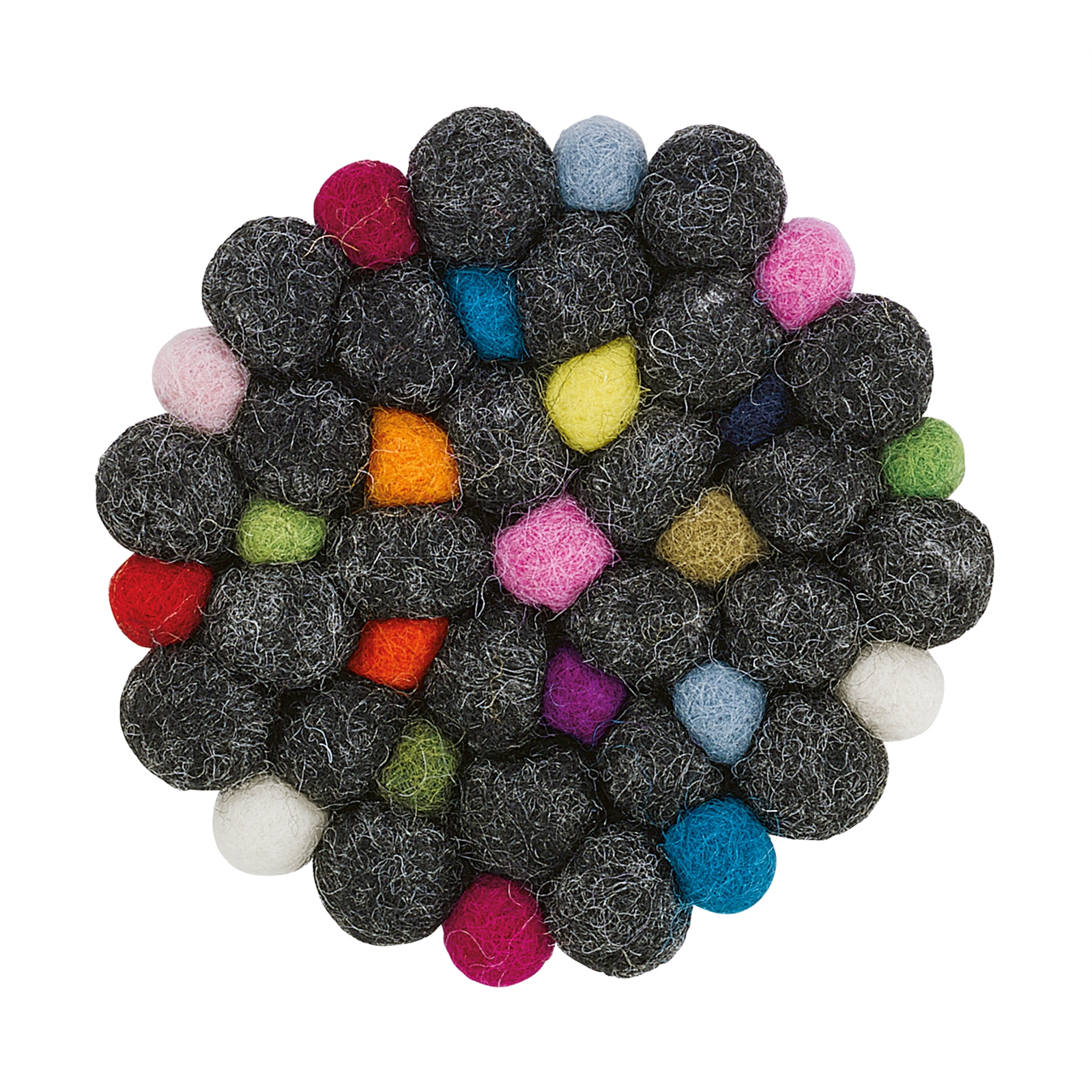 Handgefertigter und fair gehandelter Glasuntersetzer aus Schafwolle. Hitzebeständig bis 100°C und waschbar. Durchmesser 10 cm