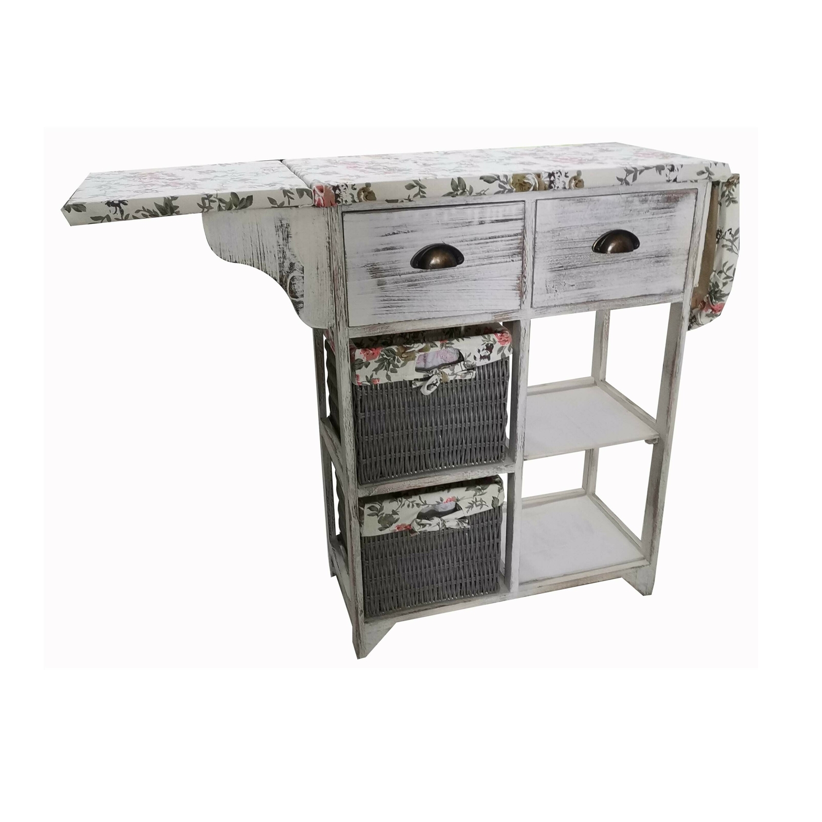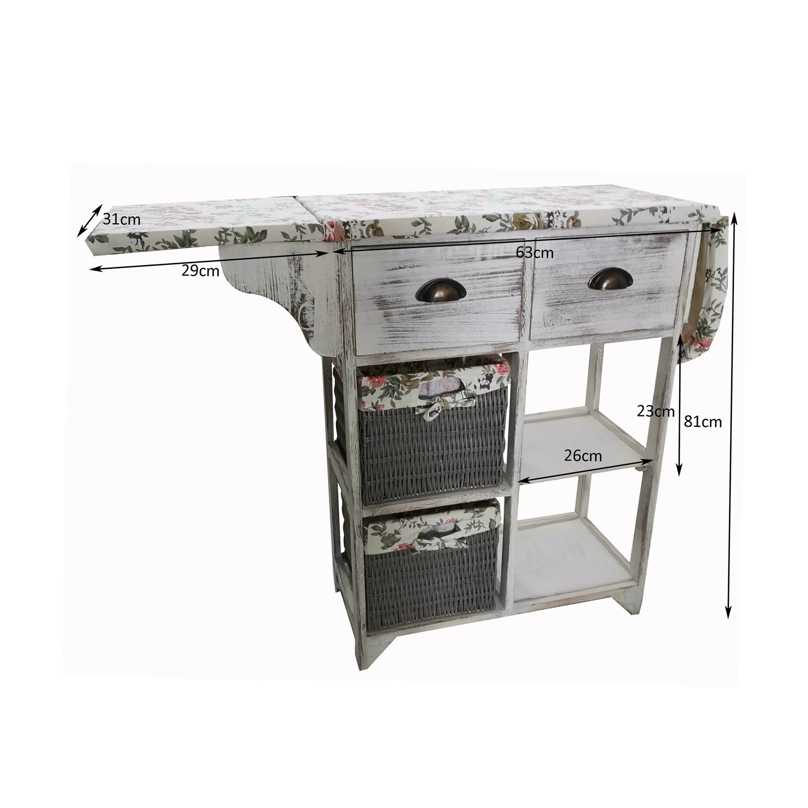 So macht Hausarbeit Spaß! Klappen Sie die seitlichen Teile hoch und schon haben Sie einen praktischen Bügeltisch. Zwei Schubladen, zwei Körben und zwei Ablageregale bieten zusätzlich viel Stauraum. Das schlichte und elegante Design in der Farbe Vintage Weiß fügt sich harmonisch in jeden Wohnbereich ein. Der Bügeltisch und die Körbe haben eine Stoffbespannung. Maße 63-122 x 81 x 31 cm (BxHxT)