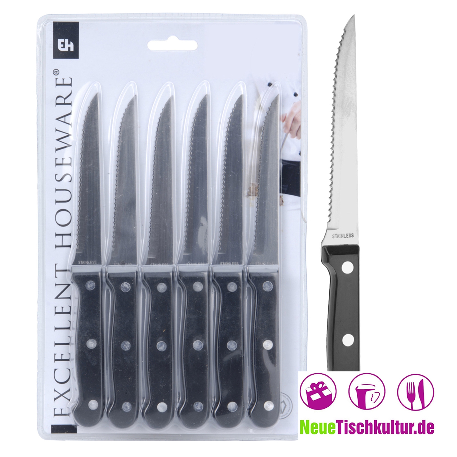 Diese praktische Steakmesser-Set gibt es zwei Varianten: als 4er Set und als 6er Set. Die Messer haben eine Klinge aus bruchfestem Stahl und zur besseren Handhabung einen stabilen Kunststoff-Griff. Ein idealer Begleiter be Ihren Grillabenden oder einfach als Basis-Messer für das tägliche Kochen.