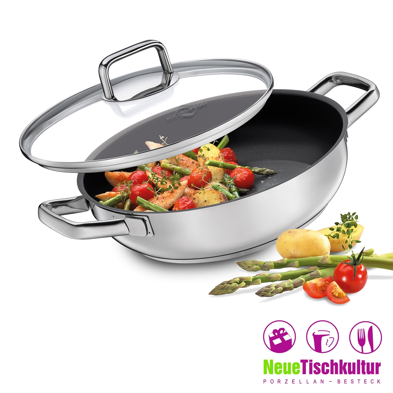 Servieren und zubereiten in einem. Die schicke Pfanne sieht nicht nur gut aus, sondern ist auch äußert praktisch. Durch die moderne und hochwerte Antihaftbeschichtung wird das Kochen und Braten ein Kinderspiel. Der Mehrschichtboden sorgt für eine optimale und gleichmäßige Wärmeverteilung.