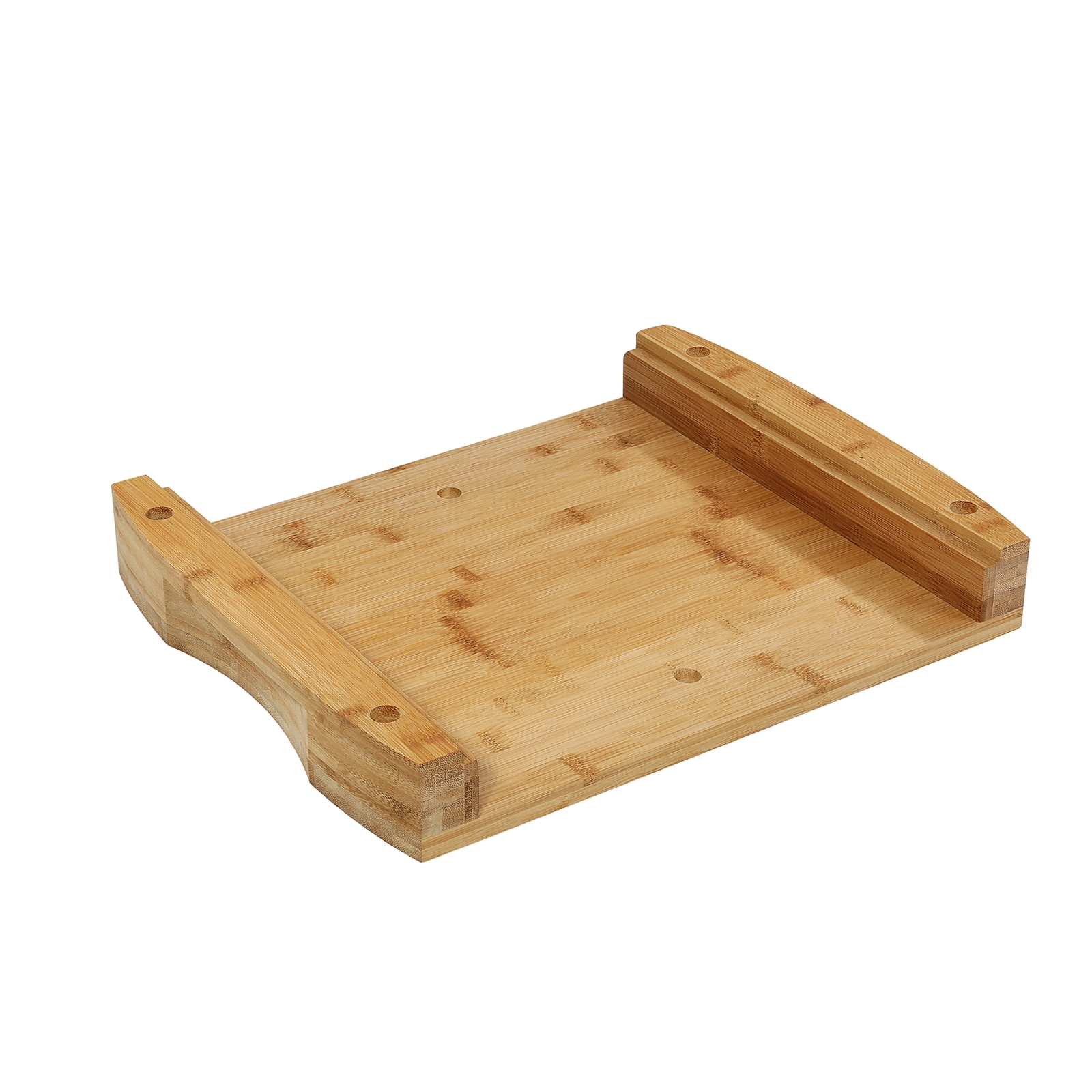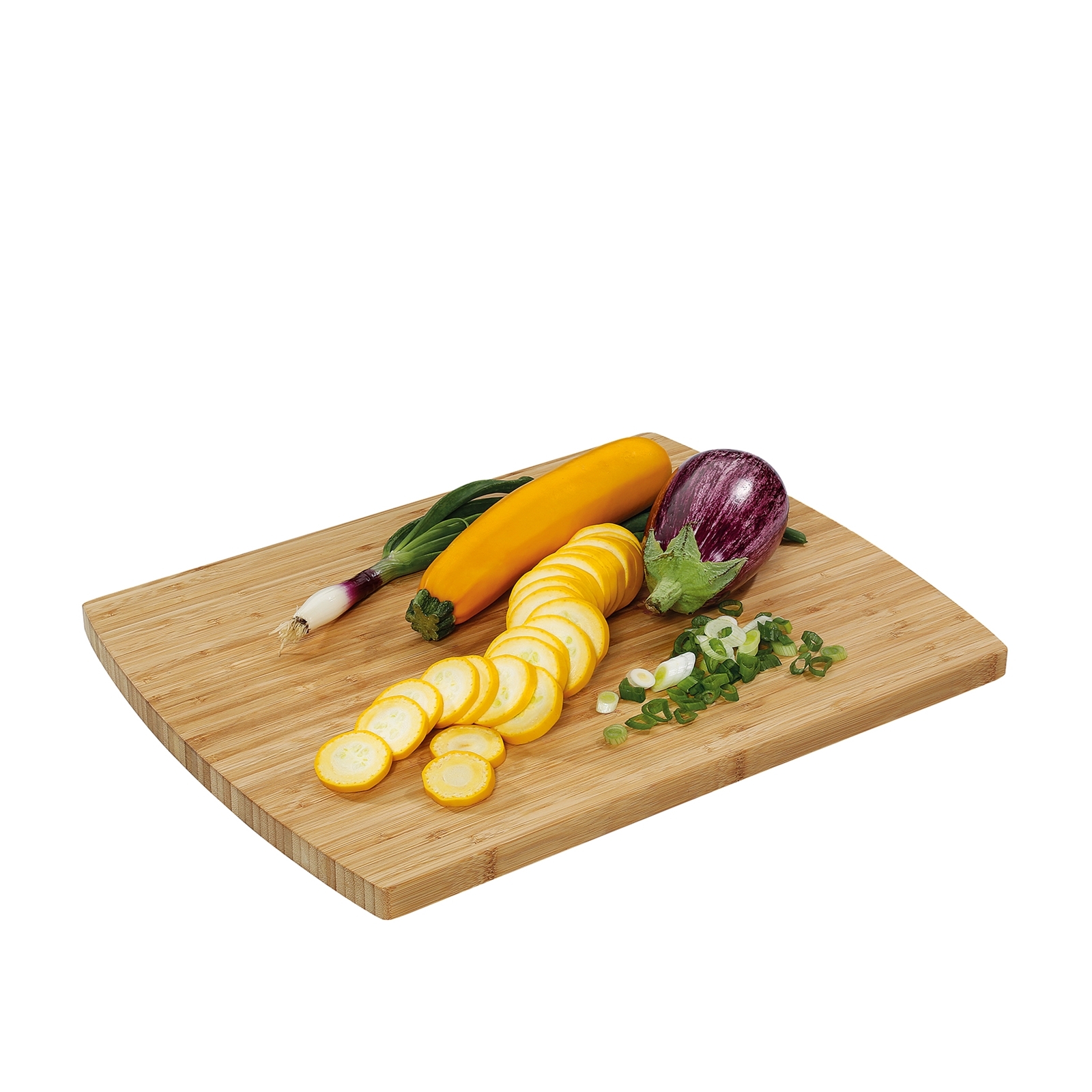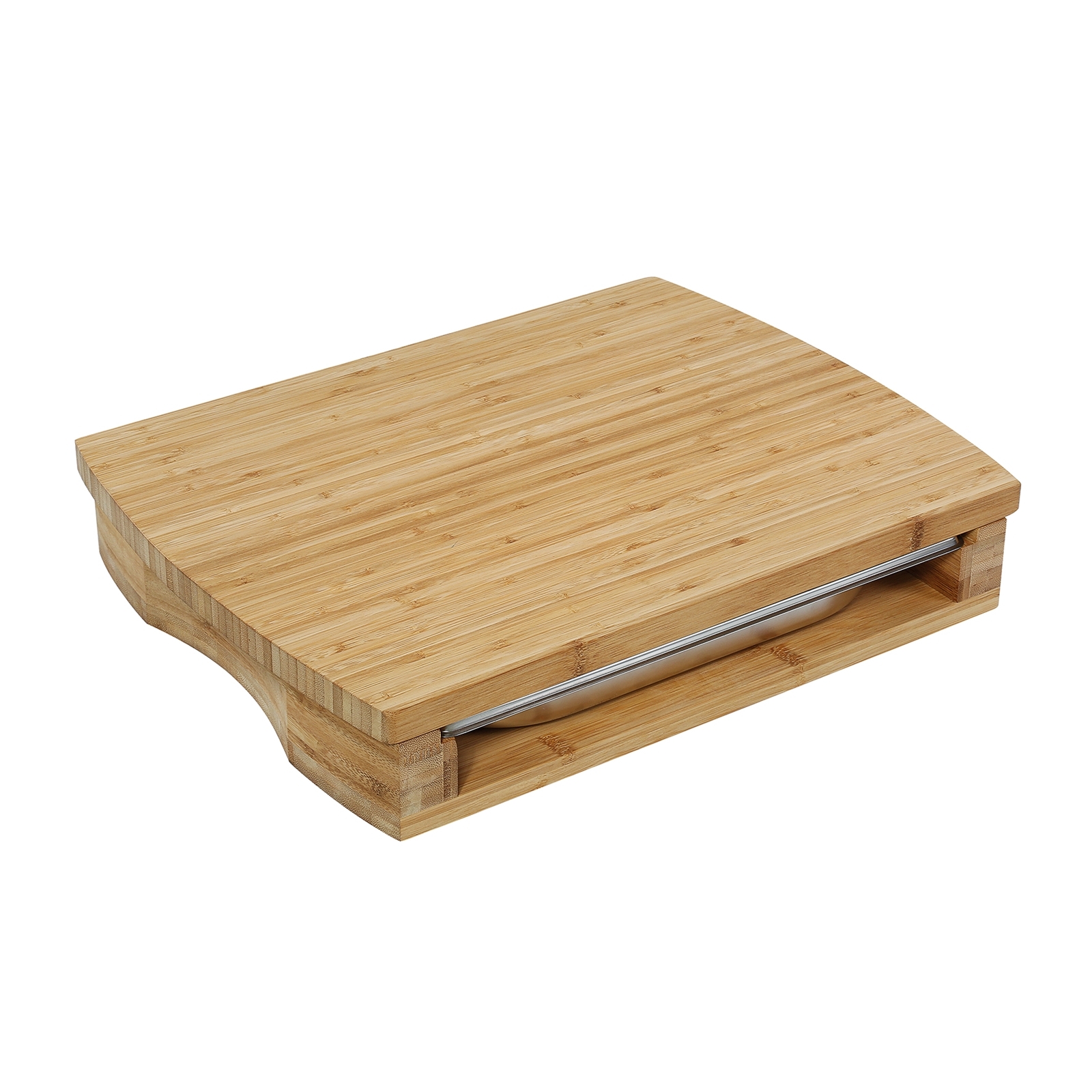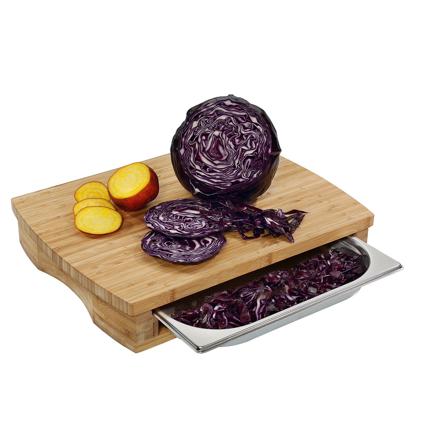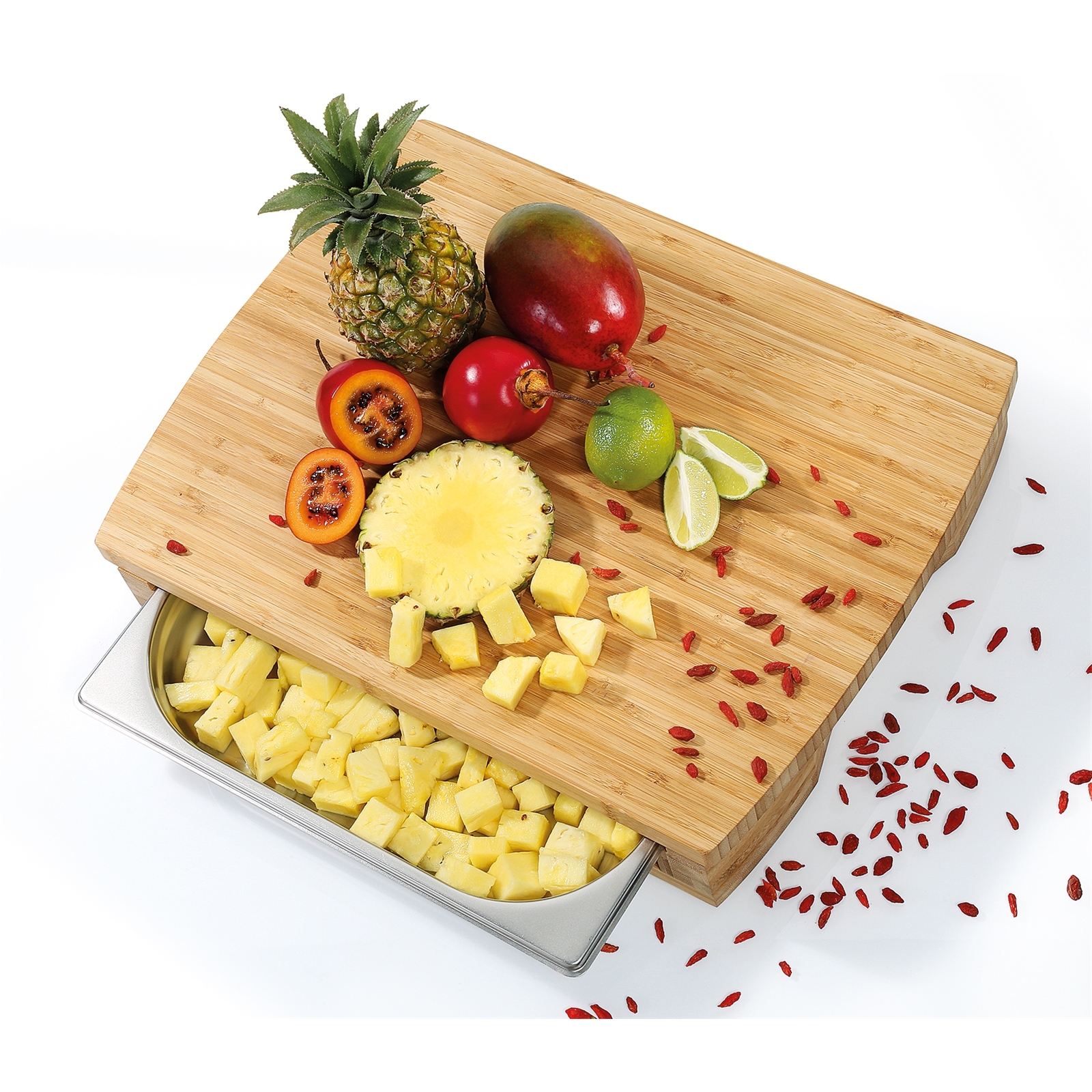 Praktisches Bambusschneidebrett mit integrierter Auffangschale aus Edelstahl. Die Griffmulden halten auch Teller und Schüsseln fest.